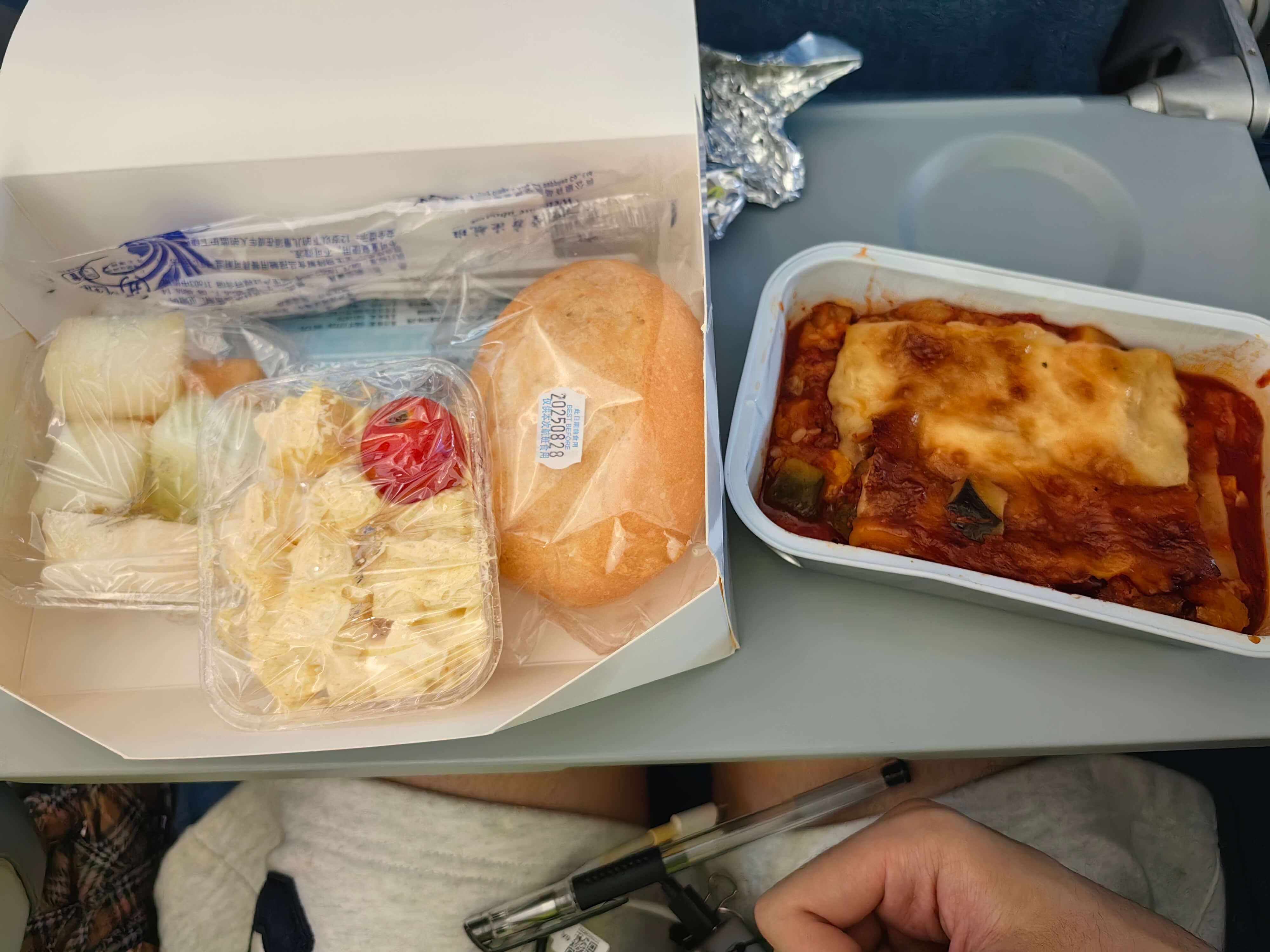 飞机餐,我在订机票时选择了“西式素餐”,千层面热乎乎的,芒果布丁很Q弹,甜甜的很好吃
