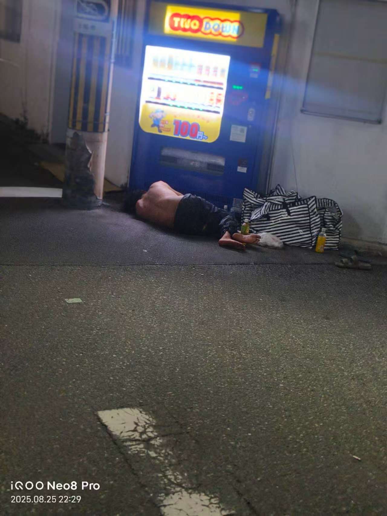 哈人,一名流浪汉躺在一个机器旁边。还是第一次见到流浪汉,现实中的日本给我留下的第一印象就是这样的。